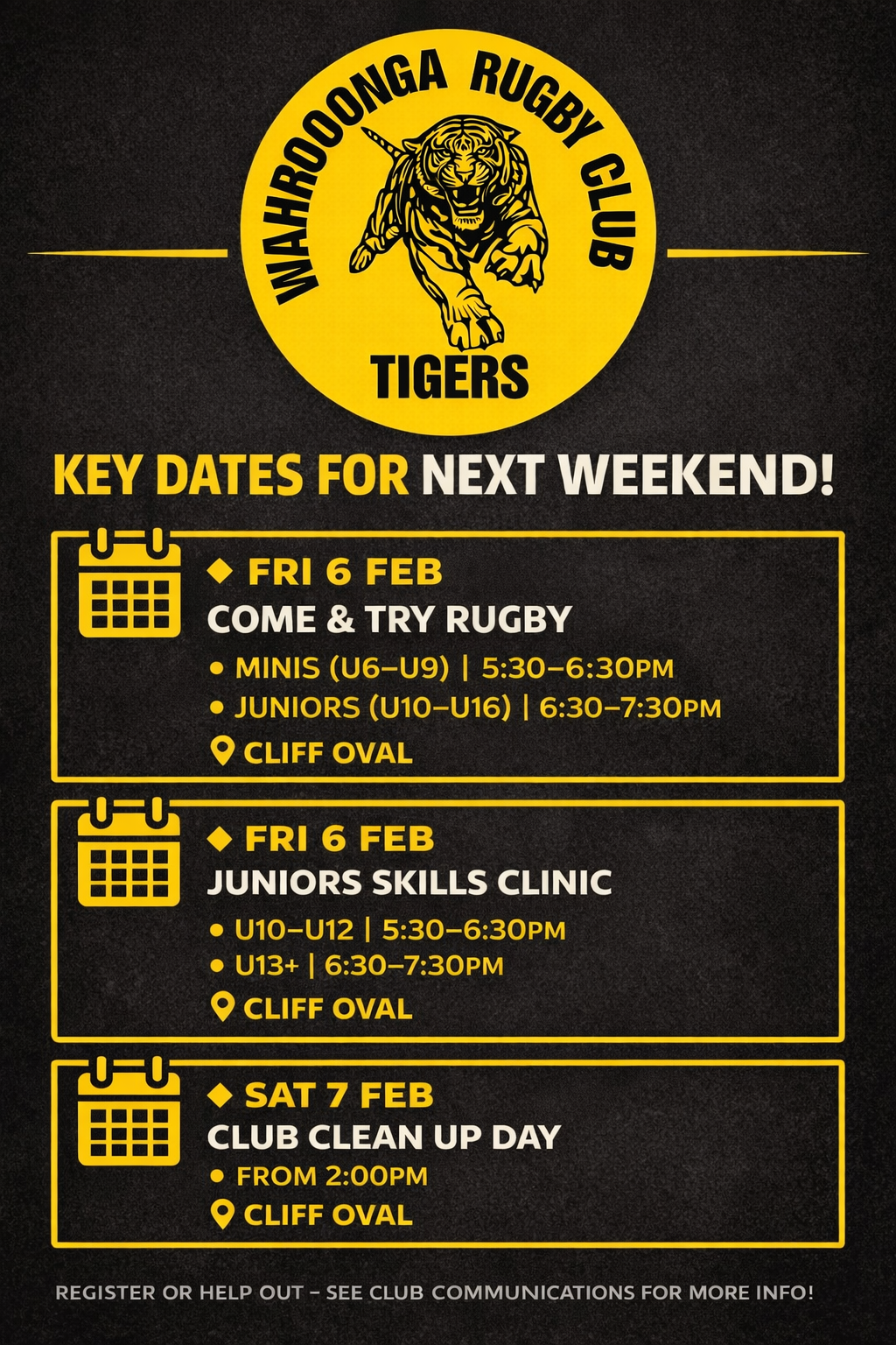Wahroonga Tigers are excited to offer professional coaching sessions at Cliff Oval for our 2026 registered Juniors — coached by the team from TryTime Rugby.