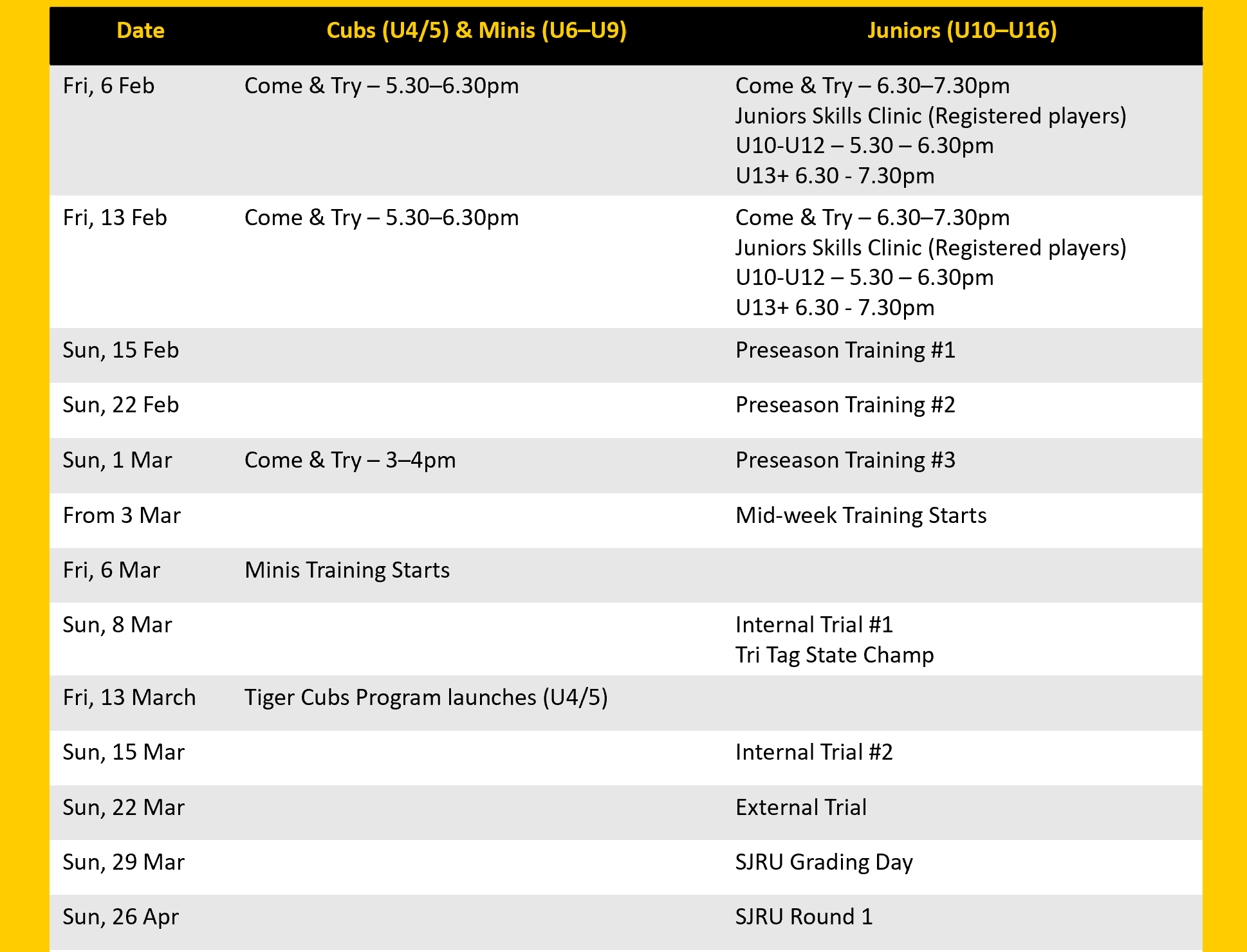 Minis Come & Try Dates (U6–U9)